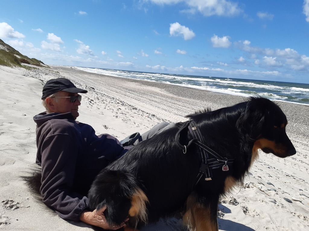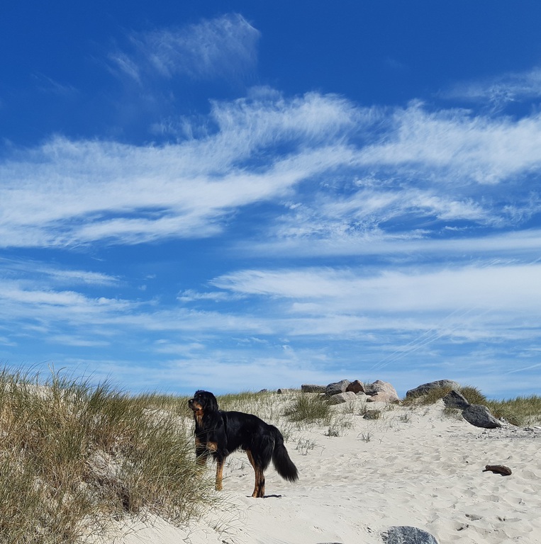 Wir hatten eine hyggelige Zeit in Dänemark bei ganz tollem Wetter! Unsere Leute waren sogar im Meer schwimmen, ich kann das leider mit dem Bandscheibenvorfall nicht mehr und Thanos setzt doch tatsächlich keine Pfote ins Wasser, der Feigling. Aber wir hatten auch so viel Spaß und haben tolle Wege in Wald und Düne entdeckt. Schade, ist schon wieder vorbei.